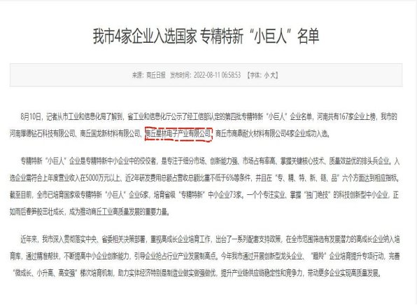 Recently, it was learned from the Shangqiu Municipal Bureau of Industry and Information Technology that the Ministry of Industry and Information Technology has identified the fourth batch of specialized and new "little giant" enterprises. The company was successfully selected by virtue of its professional deep cultivation and scientific and technological innovation strength in the field of high-performance rare earth neodymium iron boron (Nd-Fe-B) permanent magnet materials.